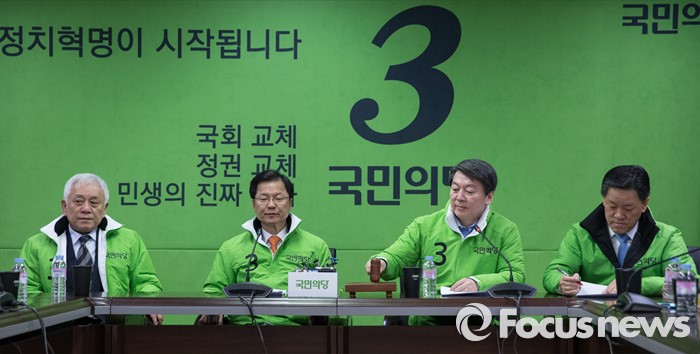 (서울=포커스뉴스) 국민의당 안철수 상임공동 대표가 26일 오전 서울 마포국 국민의당 당사에서 열린 최고위원회의에서 의사봉을 두드리고 있다. 오른쪽부터 주승용 원내대표, 안 대표, 천정배 상임공동대표, 김한길 상임공동선대위원장
