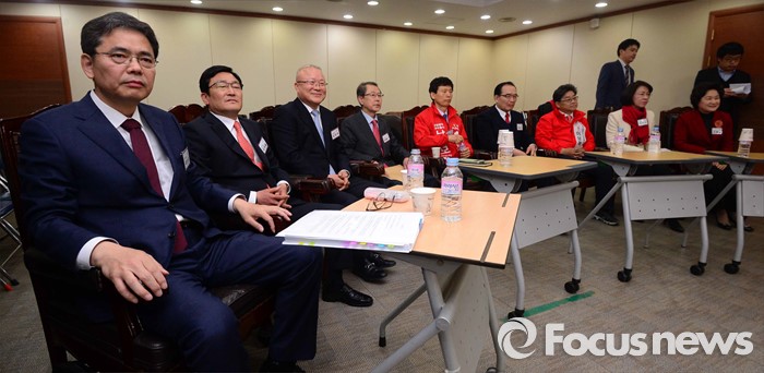 (서울=포커스뉴스) 26일 오전 서울 여의도 새누리당사에서 열린 20대 총선 공천 신청자 면접심사에 참석한 대구 중구남구 예비후보들이 면접 시작을 기다리고 있다. 곽상도, 김휘일 예비후보, 김희국 의원, 남달구, 남창모, 배영식, 이상목, 이인석, 조명희 예비후보.