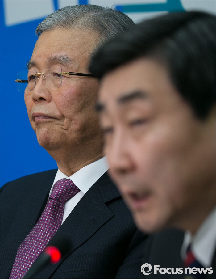 (서울=포커스뉴스) 김종인(왼쪽) 더불어민주당 비대위 대표가 26일 오전 서울 여의도 국회에서 열린 비대위-선대위 연석회의에 참석해 이종걸 원내대표의 발언을 듣고 있다.