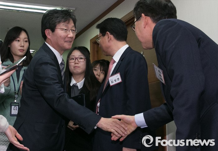 (서울=포커스뉴스) 26일 오전 서울 여의도 새누리당사에서 열린 20대 총선 공천 신청자 면접심사에 대구 동구을에 신청한 유승민(왼쪽) 의원이 면접을 마친 뒤 대구 서구에 신청한 윤두현(오른쪽) 전 청와대 홍보수석과 인사하고 있다.