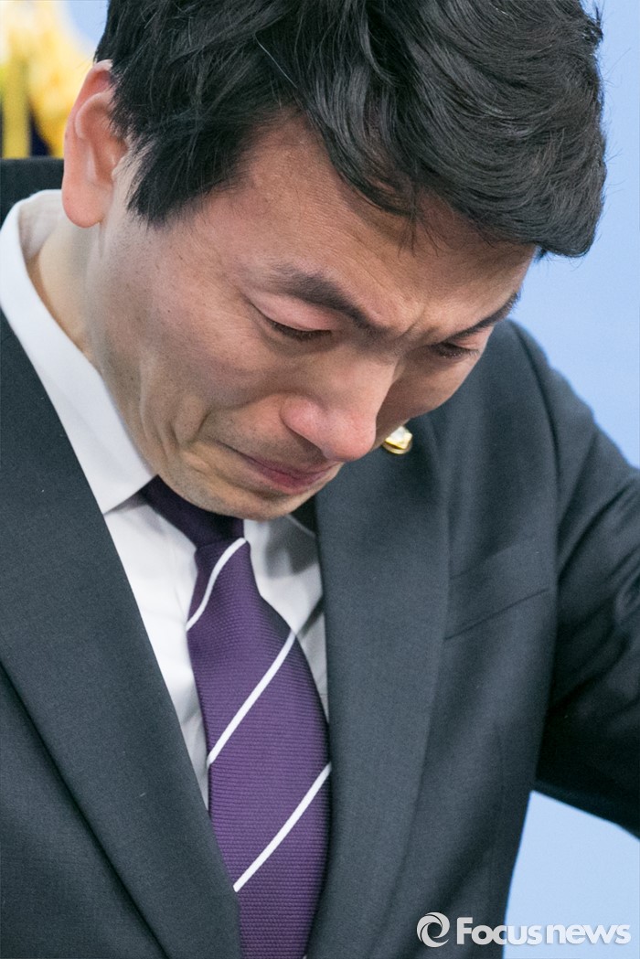 (서울=포커스뉴스) 서기호 정의당 의원이 26일 오후 서울 여의도 국회 정론관에서 총선 불출마 선언을 하며 눈물 흘리고 있다.
