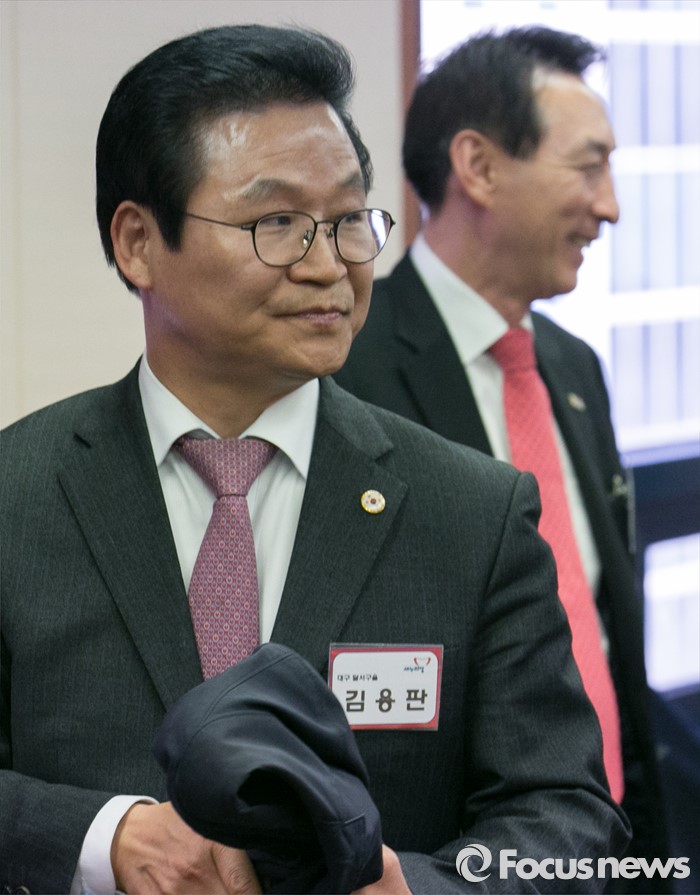 (서울=포커스뉴스) 26일 오후 서울 여의도 새누리당사에서 열린 20대 총선 공천 신청자 면접심사에 참석한 김용판(왼쪽) 대구 달서을 예비후보와 김석기 경북 경주 예비후보가 대화한 뒤 이동하고 있다.