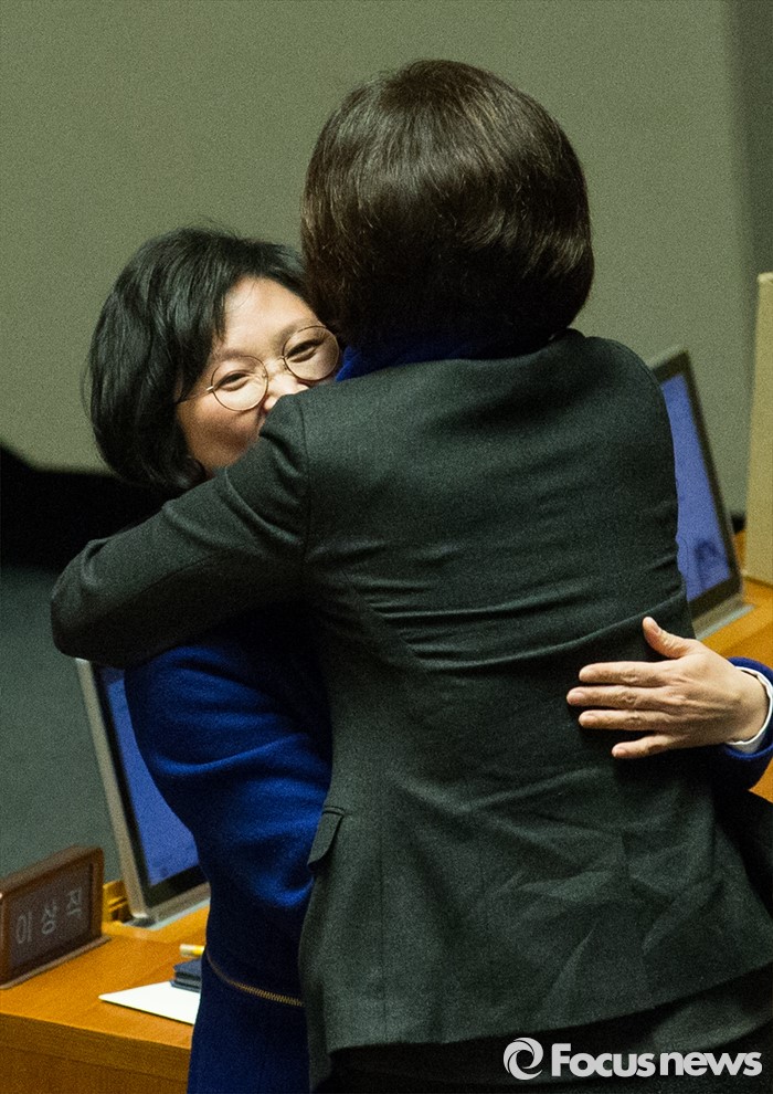 (서울=포커스뉴스) 테러방지법 직권상정에 반발해 야당이 무제한 토론(필리버스터)를 나흘째 진행하고 있는 26일 오후 서울 여의도 국회 본회의장에서 김현(왼쪽) 더불어민주당 의원이 토론을 마친 뒤 동료 의원의 격려를 받으며 퇴장하고 있다.