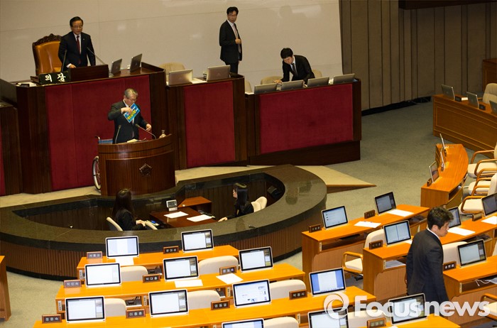 | △ 항의 후 자리 향하는 유의동 새누리당 원내대변인 |