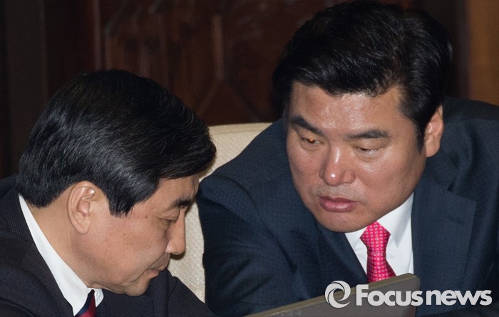 (서울=포커스뉴스) 테러방지법 직권상정에 반발해 야당이 무제한 토론(필리버스터)를 나흘째 진행하고 있는 26일 오후 서울 여의도 국회 본회의장에서 원유철(오른쪽) 새누리당 원내대표와 이종걸 더불어민주당 원내대표가 대화를 나누고 있다.