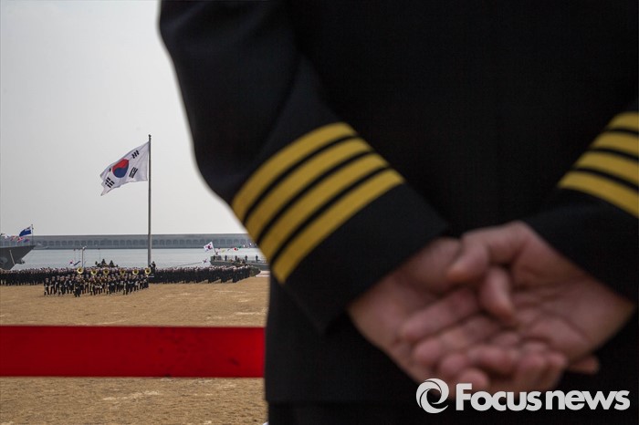 (서귀포=포커스뉴스) 26일 오후 제주 서귀포 제주해군기지에서 열린 '제주민군복합형관광미항' 준공식 행사장에서 식전 예행 연습을 하는 광경을 한 해군 관계자가 지켜보고 있다.