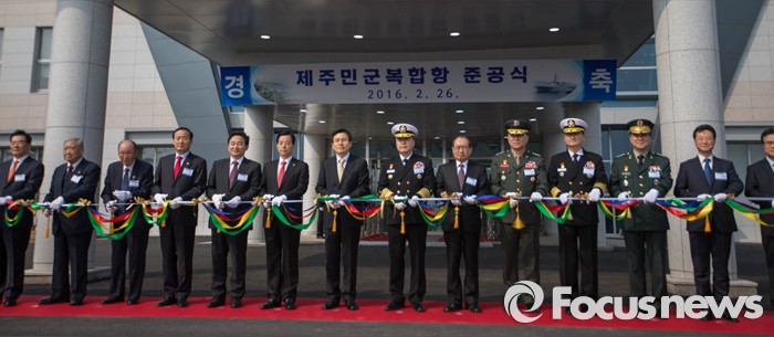 (서귀포=포커스뉴스) 황교안(왼쪽 일곱번째) 국무총리가 26일 오후 제주 서귀포 제주해군기지에서 열린 '제주민군복합형관광미항' 준공식에 참석, 기지 준공을 축하하며 테이프 커팅을 하고 있다.