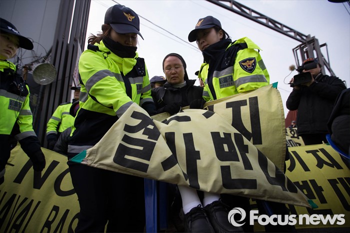 (서귀포=포커스뉴스) 26일 오전 제주 서귀포시 강정마을에서 주민들과 기지 건설을 반대하는 활동가들이 준공식이 열리는 제주 군복합형관광미한(제주해군기지) 정문 앞 부근에서 시위를 하고 있다.