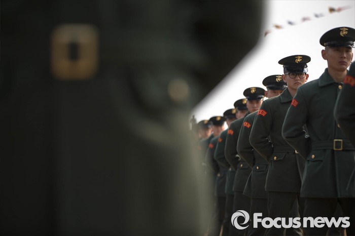 (서귀포=포커스뉴스) 26일 오후 제주 서귀포 제주해군기지에서 열린 '제주민군복합형관광미항' 준공식에 해병대 장병들이 도열해있다.