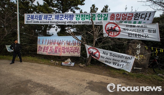 (서귀포=포커스뉴스) 26일 오전 제주 서귀포 제주해군기지 준공식이 열리는 제주해군기지 정문 앞에 기지 건설에 반대하는 현수막들이 걸려 있다.
