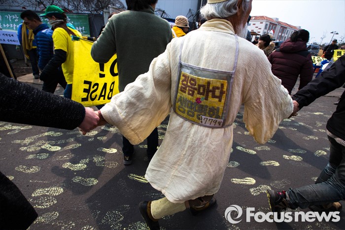 (서귀포=포커스뉴스) 26일 오전 제주 서귀포시 강정마을에서 주민들과 기지 건설을 반대하는 활동가들이 준공식이 열리는 제주 군복합형관광미한(제주해군기지) 정문 앞 부근에서 평화의 인간띠를 만들고 있다.