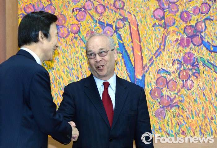 (서울=포커스뉴스) 26일 오후 서울 종로구 외교부 청사에서 윤병세(왼쪽) 외교부 장관과 대니얼 러셀 미국 국무부 동아시아태평양담당 차관보가 악수하고 있다.