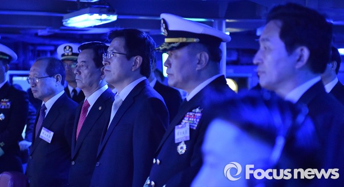 (서울=포커스뉴스) 황교안 국무총리가 26일 오후 제주 서귀포 제주해군기지에서 열린 제주민군복합형관광미항 준공식에 참석해 이지스구축함 서애류성룡함을 둘러보고 있다. <사진제공=해군>
