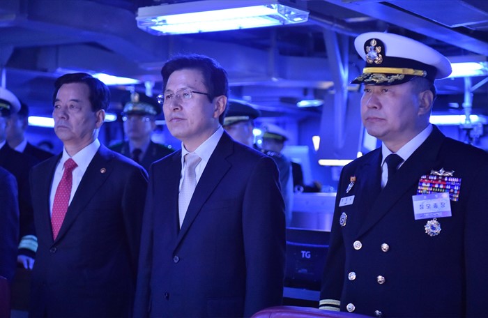 (서울=포커스뉴스) 황교안(가운데) 국무총리가 26일 오후 제주 서귀포 제주해군기지에서 열린 제주민군복합형관광미항 준공식에 참석해 이지스구축함 서애류성룡함을 둘러보고 있다. <사진제공=해군>