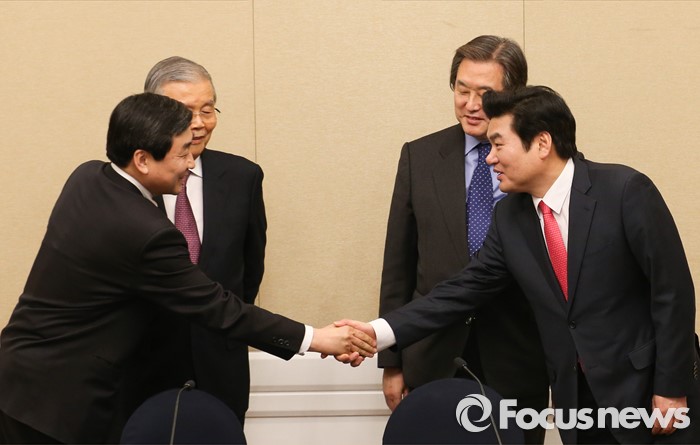 (서울=포커스뉴스) 테러방지법 직권상정에 반발해 야당이 무제한 토론(필리버스터)를 나흘째 진행하고 있는 26일 오후 서울 여의도 국회 귀빈식당에서 선거구 획정 및 쟁점법안 논의를 위해 열린 여야 지도부 회동에 앞서 참석자들이 인사하고 있다. 왼쪽부터 이종걸 더불어민주당 원내대표, 김종인 비대위 대표, 김무성 새누리당 대표, 원유철 원내대표.