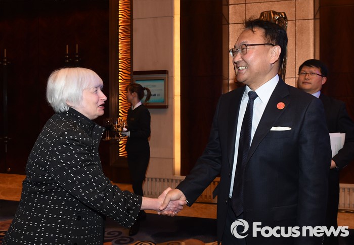 (서울=포커스뉴스) G20재무장관.중앙은행총재회의 참석차 중국 상해를 방문중인 유일호 부총리 겸 기획재정부 장관이 26일 저녁(현지시간) 푸동 상글리라 호텔에서 열린 환영리셉션에서 재닛 옐런 FRB 의장과 악수하며 인사를 나누고 있다. <사진제공=기획재정부>