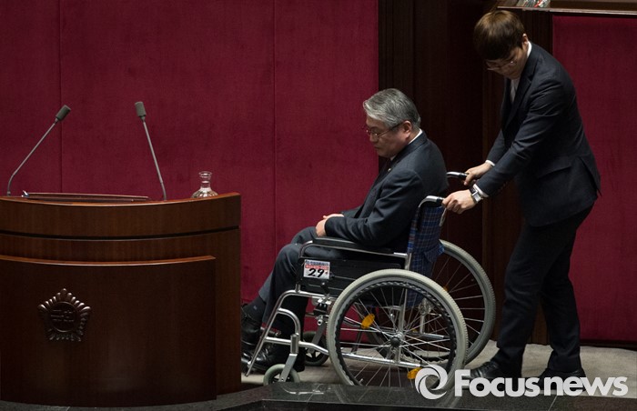 (서울=포커스뉴스) 테러방지법 직권상정에 반발해 야당의 무제한 토론(필리버스터)이 나흘째 진행되고 있는 26일 오후 서울 여의도 국회 본회의장에서 휠체어를 타고 온 김용익 더불어민주당 의원이 발언을 끝낸 후, 불편한 몸을 이끌고 발언대 밖으로 나오고 있다.