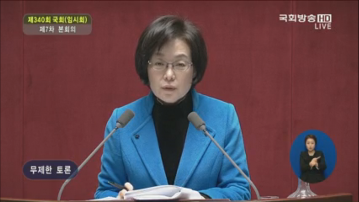 23일 오후 7시7분 김광진 더민주 의원(5시간32분)부터 시작된 야권의 필리버스터는 문병호 국민의당 의원(1시간49분), 은수미 더민주 의원(10시간18분), 박원석 정의당 의원(9시간28분), 유승희 더민주 의원(5시간20분), 최민희 더민주 의원(5시간20분), 김제남 정의당 의원(7시간4분), 신경민 더민주 의원(4시간47분), 강기정 더민주 의원(5시간5분), 김경협 더민주 의원(5시간8분), 서기호 정의당 의원(5시간18분), 김현 더민주 의원(4시간18분), 김용익 더민주 의원(2시간1분), 배재정 더민주 의원(3시간39분), 전순옥 더민주 의원(3시간32분), 추미애 더민주 의원(2시간32분), 정청래 더민주 의원(11시간 40분), 진선미 더민주 의원(9시간 16분), 최규성 더민주 의원(2시간 52분), 오제세 더민주 의원(3시간 30분) 순으로 진행됐다.박혜자 더불어민주당 의원이 28일 오전 야권의 필리버스터 21번째 주자로 나서 토론을 이어가고 있다. 2016.02.28.<사진출처=국회방송 화면 갈무리>