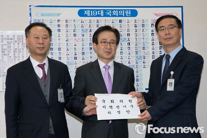 충북은 명칭과 구역 변경이 있었지만 8석에 변함 없고, 세종시와 제주도는 변화 없이 각 1석과 3석 그대로다.(서울=포커스뉴스) 김세환(오른쪽) 선거구획정위원횐 사무국장이 28일 오전 서울 여의도 국회의장실을 방문해 이명우 정무수석 비서관에게 국회의원 지역선거구 획정안을 전달하고 있다. 왼쪽부터 박수철 안행위 수석전문위원, 이명우 정무수석 비서관, 김세환 선거구획정위원회 사무국장. 2016.02.28 허란 기자