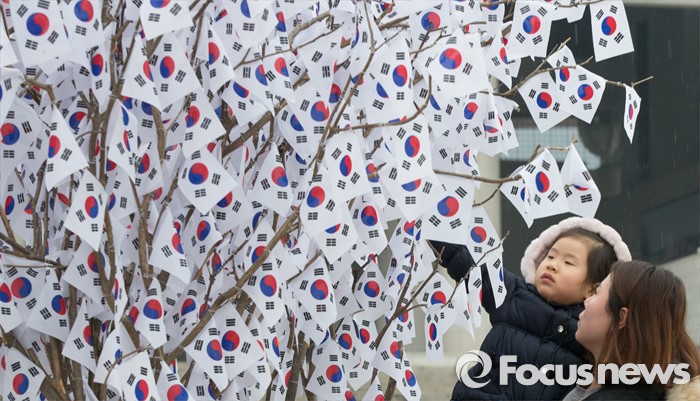 (천안=포커스뉴스) 3.1절을 이틀 앞둔 28일 오후 충남 천안 독립기념관을 찾은 어린이가 광장에 마련된 태극기 나무에 덜린 태극기를 바라보고 있다.