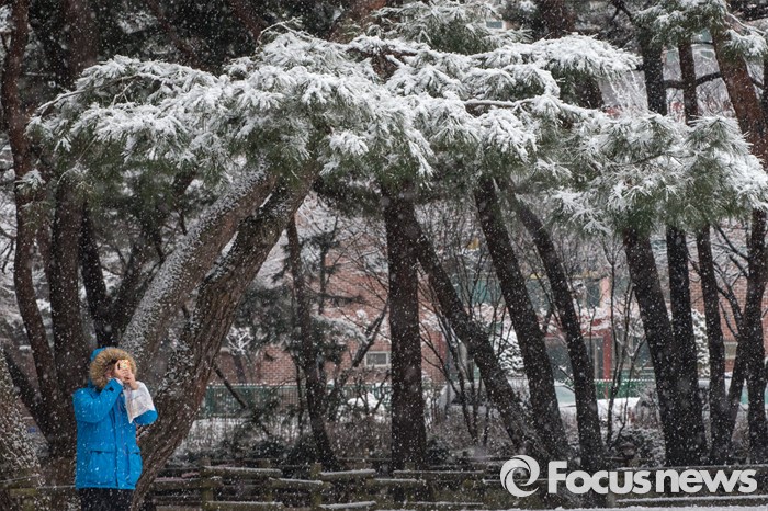 (서울=포커스뉴스) 수도권과 전국 곳곳에에 강한 바람과 함께 기습적인 폭설이 내린 28일 오후 서울 강북구 솔밭공원에서 한 시민이 사진을 찍고 있다.