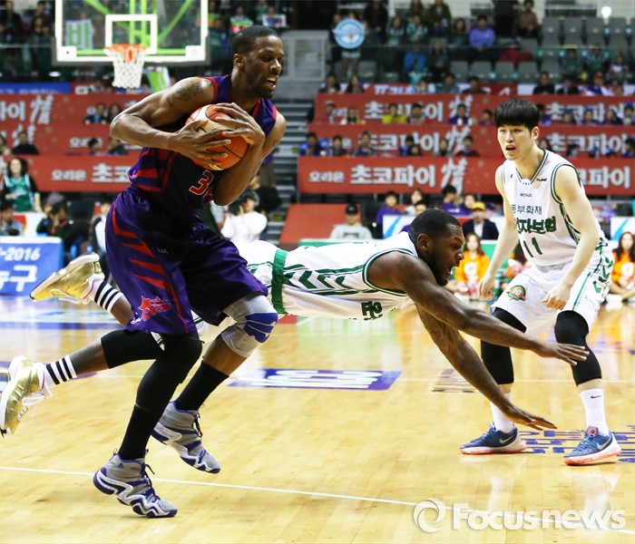 (고양=포커스뉴스) 28일 고양체육관에서 열린 2015-2016 프로농구 오리온-동부 6강 플레이오프 2차전에서 동부 맥키네스가 오리온 애런 에인즈의 볼을 가로채려 몸을 던졌으나 실패하고 있다.
