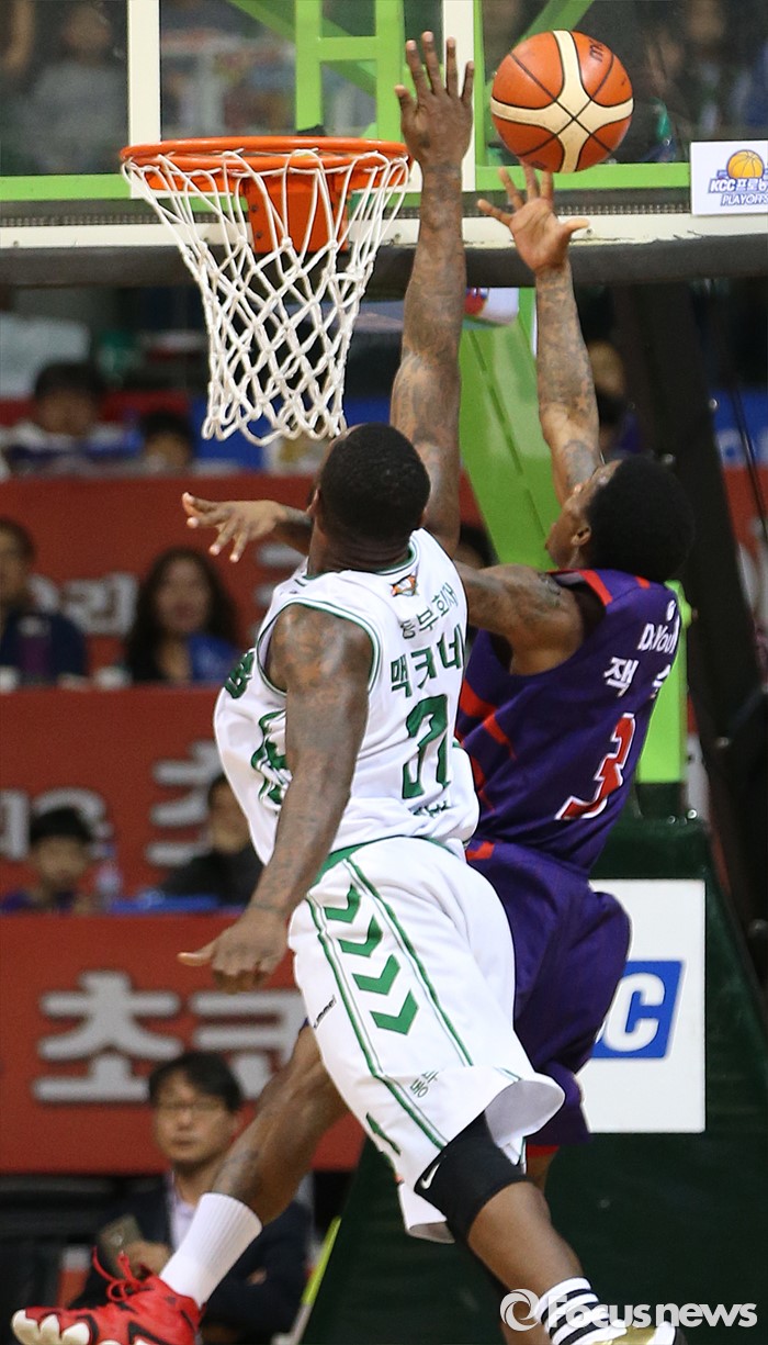 (고양=포커스뉴스) 28일 고양체육관에서 열린 2015-2016 프로농구 오리온-동부 6강 플레이오프 2차전에서 동부 맥키네스가 오리온 조 잭슨의 레이업슛을 뒤에서 블록을 시도하고 있다.