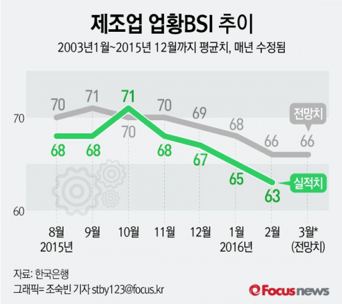 (서울=포커스뉴스) 29일 한국은행이 발표한 '2016년 2월 기업경기실사지수(BSI) 및 경제심리지수(ESI)'에 따르면 제조업의 2월 업황BSI는 63으로 6년 11개월 만에 최저 수준을 나타냈다.