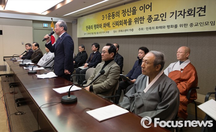 (서울=포커스뉴스) 29일 오후 서울 중구 프레스센터에서 '3.1 운동의 정신을 이어 민족의 평화와 화해, 신뢰회복을 위한 종교인 기자회견'에 참석한 천도교 박남수(오른쪽 세번째) 교령이 인사말을 하고 있다.
