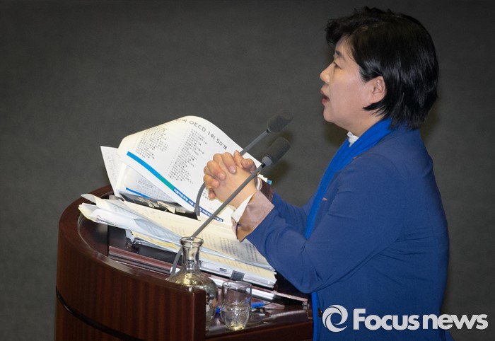 (서울=포커스뉴스) 테러방지법 직권상정에 반발해 야당이 무제한 토론(필리버스터)를 일주일째 진행하며 총 130시간을 돌파한 29일 오전 서울 여의도 국회 본회의장에서 토론에 참여한 서영교 더불어민주당 의원이 발언하고 있다.