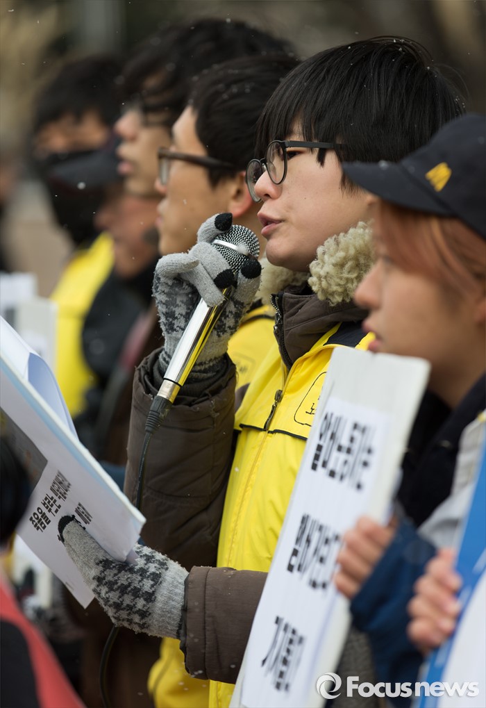 (서울=포커스뉴스) 29일 오전 서울 종로구 한국맥도날드본사 앞에서 알바노조 조합원들이 '45초 햄버거, 17분 30초 배달제 폐지' 등 10대 안건을 들고 단체교섭을 요구하는 기자회견을 하고 있다.