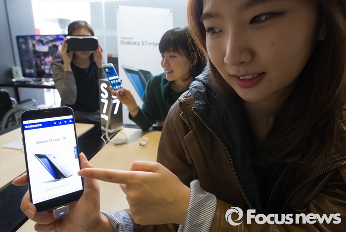 (서울=포커스뉴스) 29일 오전 서울 종로구 올레스퀘어에 마련된 갤럭시S7 사전체험존에서 직원들이 갤럭시S7과 S7엣지를 살펴보고 있다.