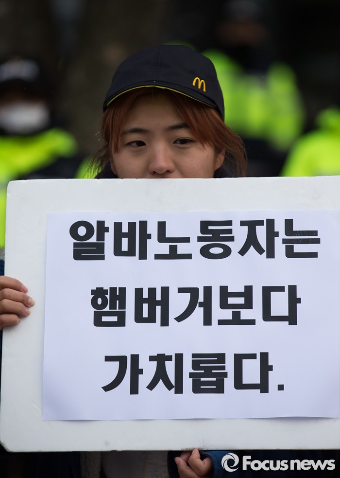 (서울=포커스뉴스) 29일 오전 서울 종로구 한국맥도날드본사 앞에서 알바노조 조합원이 '45초 햄버거, 17분 30초 배달제 폐지' 등 10대 안건을 들고 단체교섭을 요구하는 기자회견을 하고 있다.