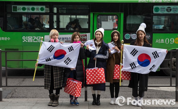 (서울=포커스뉴스) 3·1절을 하루 앞둔 29일 오전 아이돌걸그룹 '다이아'가 서울 강남역 앞에서 태극기 나눔행사를 하고 있다.