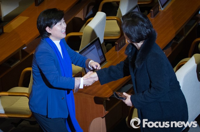 (서울=포커스뉴스) 테러방지법 직권상정에 반발해 야당이 무제한 토론(필리버스터)를 일주일째 진행하며 총 135시간을 돌파한 29일 오후, 서영교 더불어민주당 의원이 서울 여의도 국회 본회의장에서 토론을 마친 후 동려 의원들의 격려를 받고 있다.