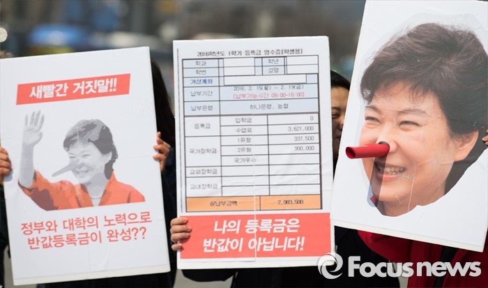 (서울=포커스뉴스) 29일 오후 서울 광화문광장에서 21세기 한국대학생연합 회원들이 정부의 반값등록금을 촉구하는 퍼포먼스를 하고 있다.