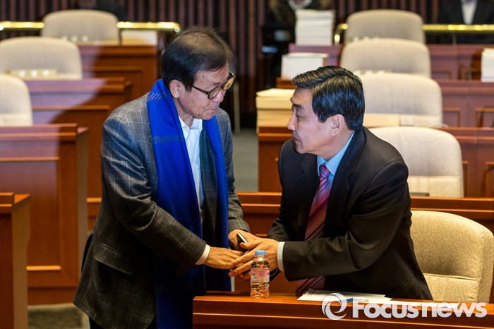 (서울=포커스뉴스) 이종걸(오른쪽) 더불어민주당 원내대표와 원혜영 더불어민주당 의원이 29일 오후 서울 영등포구 국회에서 열린 의원총회에 자리해 악수 하고 있다.