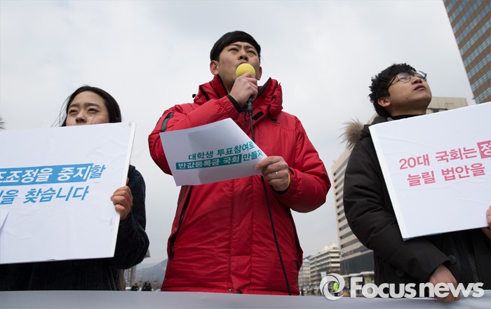 (서울=포커스뉴스) 29일 오후 서울 광화문광장에서 21세기 한국대학생연합 회원이 '4.13총선 대학생참여 네트워크 무브(Move)' 발족 기자회견문을 낭독하고 있다.