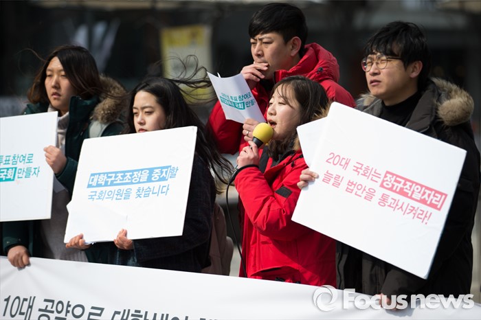 (서울=포커스뉴스) 29일 오후 서울 광화문광장에서 21세기 한국대학생연합 회원들이 '4.13총선 대학생참여 네트워크 무브(Move)' 발족 기자회견을 하고 있다.