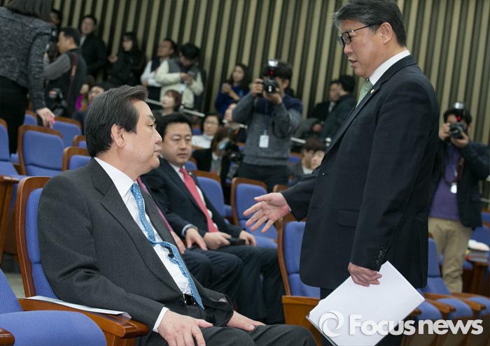 (서울=포커스뉴스) 김무성(왼쪽) 새누리당 대표와 조원진 원내수석부대표가 29일 오후 서울 여의도 국회에서 열린 의원총회에 참석해 대화하고 있다.