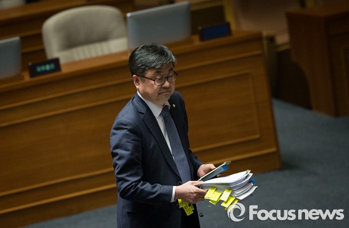 (서울=포커스뉴스) 테러방지법 직권상정에 반발해 야당이 무제한 토론(필리버스터)를 일주일째 진행하며 총 135시간을 돌파한 29일 오후, 최원식 국민의당 의원이 토론에 참여하기 위해 서울 여의도 국회 본회의장 발언대로 들어서고 있다.
