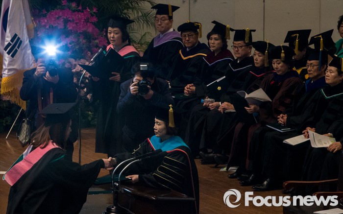(서울=포커스뉴스) 29일 오후 서울 서대문구 이화여자대학교에서 열린 2015학년도 전기 학위수여식에 참석한 졸업생이 졸업장을 받 있다.
