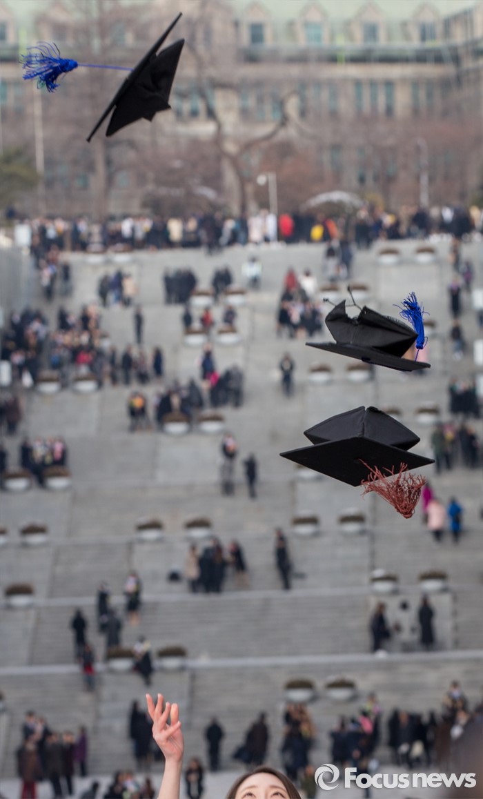 (서울=포커스뉴스) 29일 오후 서울 서대문구 이화여자대학교에서 열린 2015학년도 전기 학위수여식에 참석한 졸업생들이 학사모를 던지고 있다.