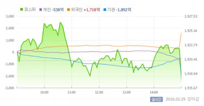 이날 코스피는 1921.76으로 장을 시작한 뒤 장초반 외국인의 매수세에 힙입어 상승세를 탔다. 그러나 개인과 기관이 동반 팔자에 나서면서 결국 하락세로 마감했다.