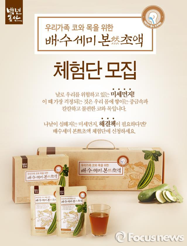(서울=포커스뉴스) 샘표는 건강식품 브랜드 '백년동안'의 '배·수세미 본연초액' 체험단을 모집한다고 29일 밝혔다.
