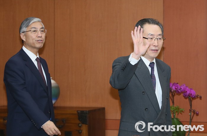 (서울=포커스뉴스) 우다웨이(오른쪽) 북핵6자회담 중국 측 수석대표가 29일 오후 서울 종로구 세종로 외교부청사에서 윤병세 외교부 장관과 면담을 위해 접견실로 들어서고 있다.