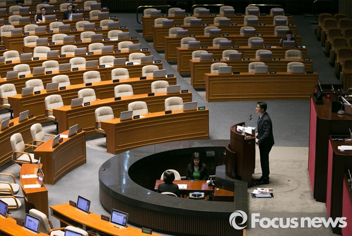 (서울=포커스뉴스) 테러방지법 직권상정에 반발해 야당이 무제한 토론(필리버스터)를 일주일째 진행하며 약 140시간을 돌파한 29일 오후 서울 여의도 국회 본회의장에서 토론에 참여한 홍익표 더불어민주당 의원이 발언하고 있다.