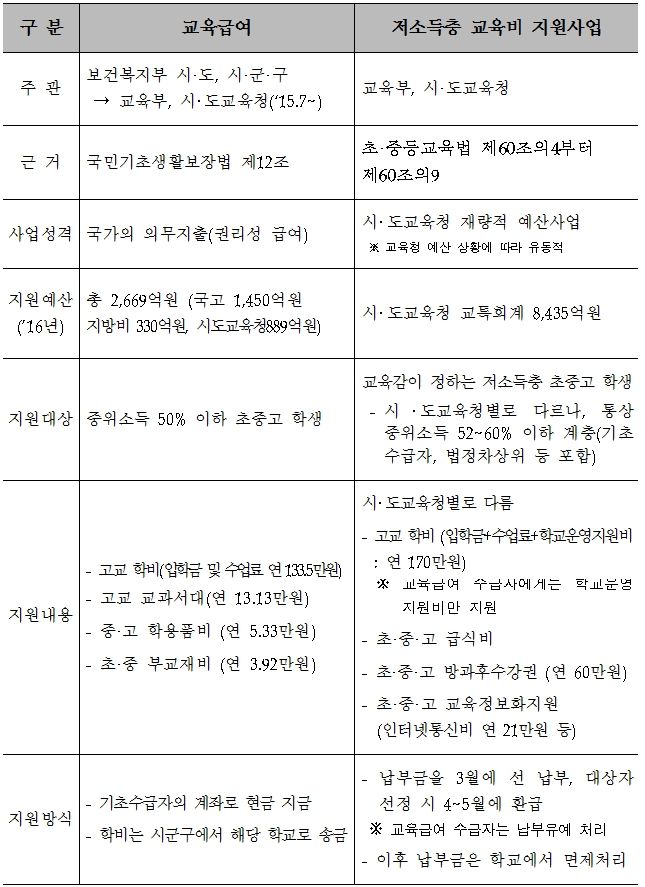 정부 관계자는 “올해 전체 지원 예산은 약 1조1000억원이며, 92만 여명의 학생이 최소 1종 이상의 교육비를 지원 받을 것”이라며 “이로 인해 저소득층 가구의 교육비용이 절감되고, 학생들의 교육 기회가 확대되어 교육 격차 해소에 이바지할 것”이라고 기대했다.교육급여와 초·중·고 교육비 지원 사업 비교 <자료출처=교육부, 보건복지부>