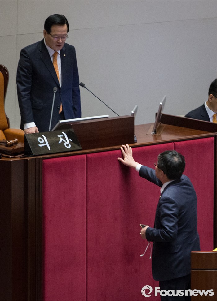 (서울=포커스뉴스) 테러방지법 직권상정에 반발해 야당이 무제한 토론(필리버스터)를 일주일째 진행하며 총 140시간을 돌파한 29일 오후 서울 여의도 국회 본회의장에서 토론에 참여한 최원식 국민의당 의원이 발언을 마친 후 정의화 의장과 대화하고 있다.