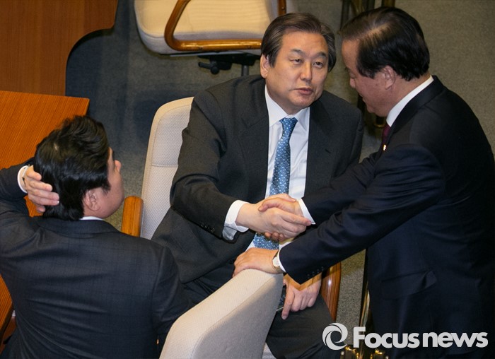 (서울=포커스뉴스) 테러방지법 직권상정에 반발해 야당이 무제한 토론(필리버스터)를 일주일째 진행하며 약 140시간을 돌파한 29일 오후 서울 여의도 국회 본회의장에서 정갑윤(오른쪽부터) 국회 부의장, 김무성 새누리당 대표, 원유철 원내대표가 대화하고 있다.
